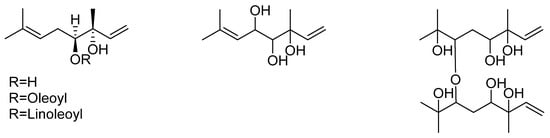 The presence of monoterpenoids in the fruiting body of D. indusiata was established by the work of Ishiyama et al. [] that identified five monoterpene alcohols. One of these was (3R, 4S)-3, 7-dimethyl-1, 6-octadien-3, 4-diol which was also found as an oleoyl or linoleoyl ester derivative at the 3-hydroxyl position (Figure 3). Other derivatives include a trihydroxyl acyclic monoterpene with undefined stereochemistry and a dimeric ether derivative (Figure 3).