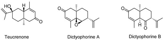 As a representative of the sesquiterpenes class of terpenoids, Kawagishi et al. [] have isolated three eudesmane-type compounds, teucrenone and novel derivatives, dictyophorines A and B (Figure 4). The biological significance of these compounds was also shown as they displayed stimulatory effect in astroglial cells to enhance the synthesis of nerve growth factor (NGF). Another representative compound of sesquiterpenes class from the fungus is albaflavenone (Figure 5) which is known for its antibiotic activities. From the dried fruiting body, Huang et al. [] identified albaflavenone and its concentration was established as about 0.0063% of the dried fungal material.