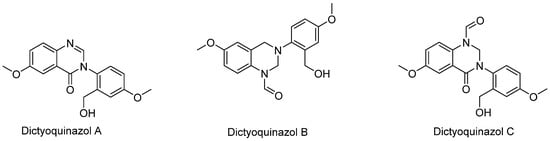 The identification of alkaloids from the methanolic extract of D. indusiata have been described by Lee et al. []. The structures of three of these compounds (dictyoquinazol A–C) are shown in Figure 6. Due to their neuroprotective effect, the synthesis of dictyoquinazol A and derivatives have been studied in recent years with special reference to their potential application in stroke []. Oh and Chong Song [] have also published a six-steps total synthesis procedure for dictyoquinazol A starting from 5-methoxy-2-nitrobenzoic acid in the yield of 36%; while dictyoquinazol B and C were also obtained from dictyoquinazol A as a starting material.
