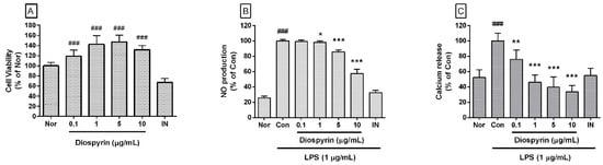 Effect of diospyrin on cell viability, NO production, and calcium release in lipopolysaccharide (LPS)-induced RAW 264.7 cells. After 24 h treatment, cell viability (A) was evaluated via a modified MTT assay and nitric oxide (NO) production (B) was measured using the Griess reaction assay. Calcium release (C) was measured with Fluo-4 calcium assay after 18 h treatment. Data are of mean ± SD and pooled from more than three independent experiments. Nor, normal group (media only); Con, control group (LPS alone); IN, indomethacin (0.5 µM). ### p < 0.001 vs. Nor; * p < 0.05 vs. Con; ** p < 0.01 vs. Con; *** p < 0.001 vs. Con.