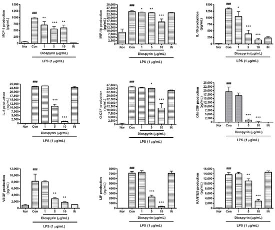 Effect of diospyrin on production of monocyte chemotactic protein (MCP)-1, macrophage inflammatory protein (MIP)-1β, granulocyte colony-stimulating factor (G-CSF), granulocyte macrophage colony-stimulating factor (GM-CSF), vascular endothelial growth factor (VEGF), RANTES/CCL5, leukemia inhibitory factor (LIF; IL-6 class cytokine), interleukin (IL)-6, and IL-10 in LPS-stimulated RAW 264.7. Data are of mean ± SD and pooled from more than three independent experiments. Nor, normal group (media only); Con, control group (LPS alone); IN, indomethacin (0.5 µM). ### p < 0.001 vs. Nor; * p < 0.05 vs. Con; ** p < 0.01 vs. Con; *** p < 0.001 vs. Con.