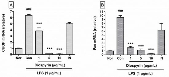 Effect of diospyrin on mRNA expression of C/EBP homologous protein (CHOP) (A) and Fas (B) in LPS-induced RAW 264.7 were measured with real-time RT-PCR after 18 h incubation with compounds. β-actin was used as the housekeeping gene. Nor, normal group (media only); Con, control group (LPS alone). IN denotes indomethacin (0.5 µM). Values are the mean ± SD of three independent experiments. ### p < 0.001 vs. Nor; *** p < 0.001 vs. Con.