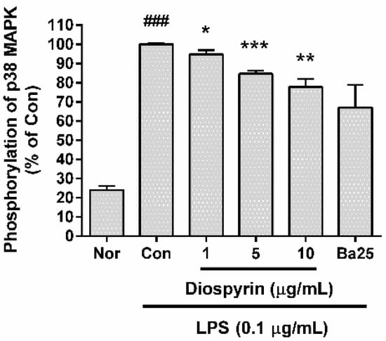 Effect of diospyrin on the phosphorylation of p38 MAPK in LPS-induced RAW 264.7 cells. After 15 min of treatment, the phosphorylation of p38 MAPK was measured via flow cytometry. The normal group (Nor) was treated with media only. The control group (Con) was treated with LPS (0.1 µg/mL) alone. Ba25 denotes baicalein (25 µM). Values are the mean ± SD of three independent experiments. ### p < 0.001 vs. Nor; * p < 0.05 vs. Con; ** p < 0.01 vs. Con; *** p < 0.001 vs. Con.