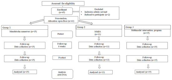 For the compound intervention application group, Mendelsohn maneuver intervention was applied for 15 min and NMES intervention was applied additionally for 15 min. For all treatment groups, the program was introduced and the baseline was measured in the first session. A 30-min intervention session was given to a subject from the second session to the 16th session.