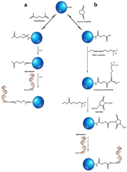 Conjugation of SNs-NH2 with Sgc8 aptamer using glutaraldehyde (a) or succinic anhydride and EDAC/Sulfo-NHS (b).