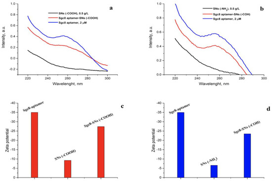 UV-absorbance spectra of Sgc8-aptamer (2 μM), SNs-COOH (C = 0.5 g/L), and Sgc8-SNs-(COOH) (C = 0.5 g/L) (a) and SNs-NH2 (C = 0.5 g/L) and Sgc8-SNs-(COH) (C = 0.5 g/L) (b) in water. Zeta potential values of Sgc8-aptamer, SNs-COOH, and Sgc8-SNs-(COOH) (c) and Sgc8-aptamer, SNs-NH2, and Sgc8-SNs-(COH) (d) measured in water.