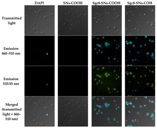 Interestingly, while DAPI stained only cells with a damaged cellular membrane (presumably, necrotic cells), SNs-NH2 and SNs-COOH conjugated with Sgc8-aptamer labeled all cells. Moreover, due to the wide emission spectrum of Tb-TCAS-doped SNs with maximum intensity peaks at 489 nm and 541 nm, they were observed in two fluorescence channels.