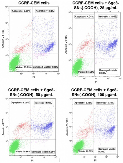Cell viability assay with Annexin V-FITC and propidium iodide was performed according to the published protocol [28]. Briefly, 8 × 106 CCRF-CEM cells were incubated with different concentrations (0 µg/mL, 25 µg/mL, 50 µg/mL, and 100 µg/mL) of Sgc8-SNs-COOH. After 24 and 48 h, cells were centrifuged and washed with 10 mL of PBS two times and suspended in 100 µL of the binding buffer. Then, 6 µL Annexin V-FITC/PI (Gibco by Life Technologies) mixture was added to all samples for 15 min at 4 °C in the dark. Finally, 400 µL of binding buffer was added to the samples, and they were analyzed with a Gallios Flow Cytometer (Beckman Coulter, Brea, CA, USA).