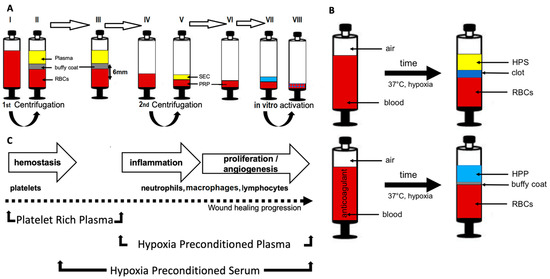 Method of preparation of different blood-derived secretomes and their correlation with the physiological wound healing phases. (A) Preparation of platelet-rich plasma (PRP). Main procedure steps are shown by arrows. (I) Tube with anticoagulant after blood sampling. (II) After 1st centrifugation, blood has been separated into the shown layers. (III) Collection of all content (including the buffy coat) above the mark (6 mm), and (IV) transfer to another tube without anticoagulant before re-centrifugation. (V) After 2nd centrifugation, there is a division into serum component (SEC) and PRP. (VI) Separation of PRP (0,5 mL) from the SEC. (VII) Activation of PRP with Thrombin and CaCl2, or by CaCl2 only. (VIII) Activated PRP as a final product (blue dots represent released growth factors in PRP). (B) Preparation of hypoxia preconditioned secretomes (HPS, HPP). Blood is allowed to clot (top), or anticoagulated (bottom), and PBCs (in clot or buffy coat) are preconditioned under pericellular (local) hypoxia (~1% O2) and physiological temperature (37 oC) for 4 to 7 days. Sedimentation passively separates growth factor-rich hypoxia preconditioned serum (HPS) or hypoxia preconditioned plasma (HPP) from clot or buffy coat, respectively, and red blood cells (RBCs) at the bottom (C) Overview of the correlation of the two categories of blood-derived secretomes with the key cell types involved in wound healing, and the corresponding wound healing phases. PRP comprises an increased concentration of platelet-derived growth factors, which is naturally achieved during hemostasis through platelet concentration within the fibrin clot, while HPS and HPP mostly comprise hypoxia-induced factors, which are naturally produced by PBCs during the inflammatory and proliferative phases.