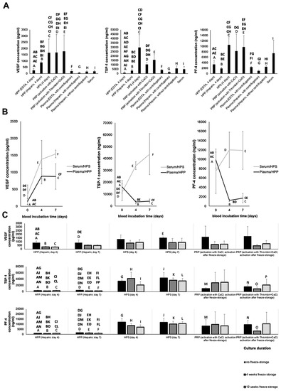 Quantitative analysis of pro- (VEGF) and anti-angiogenic (TSP-1, PF-4) factor concentration in blood-derived secretomes. (A) Plot showing the concentration of VEGF (pg/mL); TSP-1 (ng/mL) and PF-4 (ng/mL) in the various blood-derived secretomes tested (n = 5). Note that HPP and HPS were prepared without centrifugation. EDTA and heparin were used as blood anticoagulants in HPP and plasma preparation. (B) Effect of blood incubation time (days) on pro- (VEGF) and anti- (TSP-1, PF-4) angiogenic factor concentration in hypoxia preconditioned secretomes over 4 and 7 days preconditioning (n = 5). (C) Effect of freeze-storage on factor bioavailability. Plots comparing the VEGF, TSP-1 and PF-4 concentrations in fresh blood-derived secretomes and in secretomes stored for 4 and 12 weeks at −20 °C before testing (n = 5). Capital letter pairs over plots indicate statistical comparison of corresponding data points. For all pair comparisons, p < 0.05, unless otherwise indicated. Error bars represent s.d.