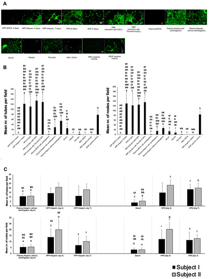 The angiogenic potential of blood-derived secretomes was tested in an in vitro angiogenesis assay, by assessing their ability to induce tube formation in human umbilical vein endothelial cells (HUVECs, CellSystems, Germany), seeded on factor-reduced Matrigel (BD, Germany). HUVECS were seeded at a density of 10 × 103 well, with 50 μL of test or control media added per well (μ-Slide Angiogenesis, Ibidi, Germany), and cultured in 5% CO2/37 °C for 12 h. Cells were then stained with Calcein AM (PromoKine, Germany), and tube formation was observed with fluorescence and phase contrast microscopy. Assessment of the extent of capillary-like network formation was carried out by counting the number of tubes and nodes (a node was defined as the point of intersection of two or more tubules), and quantification of tube length was carried out with image analysis using imageJ software (NIH, USA). Blood-derived secretomes were tested immediately after the predefined incubation period (4 or 7 days), and after storage for 4 or 12 weeks at −20 °C degrees, as indicated. At least three wells were tested per sample (n = 5), per condition.