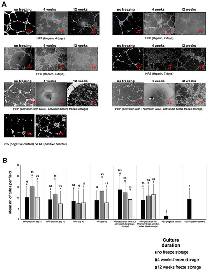 Effect of blood-derived secretome freeze-storage on angiogenic activity. (A) Panel showing representative images of the tube formation assay carried out with HPP, HPS and PRP secretomes that underwent freeze storage for 4 and 12 weeks (Bars = 100 µm). (B) Plot comparing the mean number of tubes formed in endothelial cell cultures in the presence of fresh blood-derived secretomes or secretomes that underwent freeze-storage for 4 and 12 weeks at −20 °C (n = 5) (p < 0.001). Capital letter pairs over plots indicate statistical comparison of corresponding data points. For all pair comparisons p < 0.05, unless otherwise indicated. Error bars represent s.d.