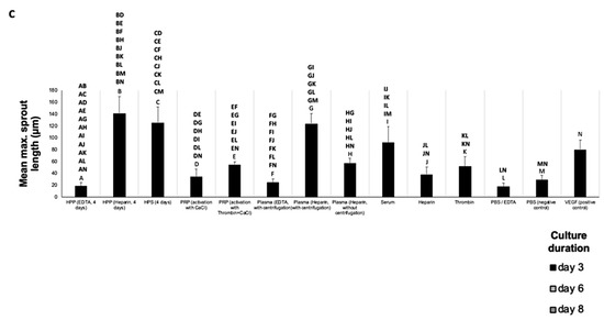Having assessed the ability of the various blood-derived secretomes to induce microvessel formation in vitro, an analysis of microvessel sprouting was carried out using the mouse aortic ring assay. Screening for sprouting angiogenesis only showed small differences between hypoxia preconditioned and platelet-derived secretomes (Figure 5A,B). In all secretome cultures, we observed a trend for an increasing number of sprouts as culture duration increased (3, 6 and 8 days), although such differences were again non-significant, due to the high standard deviation seen between samples (Figure 5B). Similar to the tube formation assay, fresh plasma and HPP prepared with EDTA as anticoagulant induced significantly a smaller number of sprouts than their heparin-anticoagulated counterparts (p < 0.001).