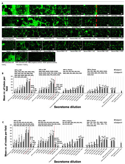 Effect of hypoxia preconditioned secretome dilution on microvessel formation in HUVEC cultures in vitro. (A) Panel showing representative images of the tube formation assay (12 h), carried out in the presence of the shown diluted blood-derived secretomes (Bars = 100 µm). (B,C) Plot showing the mean number of tubes (B) and nodes (C) formed in cultures with different blood-derived secretome and basal control dilutions (1:1 to 1:1000), for blood obtained from two individual subjects (n = 3 per subject). The red dashed line indicates the statistically significant cut-off point of dilution. Capital letter pairs shown directly above histograms indicate intra-condition statistical comparison of corresponding data points, while HPP/HPS vs. Plasma/Serum and HPP/HPS vs. PRP statistical comparisons are shown on the upper part of plot B and C. For all pair comparisons p < 0.05, unless otherwise indicated. Error bars represent s.d.