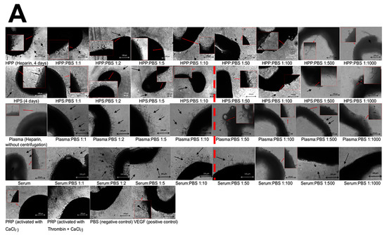 The effect of secretome dilution was also tested in the aortic ring assay, which showed that microvessel sprouting increased with a more prolonged culture time (3, 6 and 8 days), and behaved in a similar manner to tube formation, with increasing dilutions generating a gradually greater response, although here differences were less significant due to the high standard deviation seen between samples (Figure 7A,B). HPS, as well as fresh serum and plasma produced the previously seen bell-shaped profile, but with the cut-off point being observed earlier, at the 1:10 dilution (Figure 7A,B). No distinct peak was observed in the HPP dilution series, although here dilutions equal to or greater than 1:500 also generated only a very small response. According to our previous data, HPS and PRP generated a similar mean number of sprouts, however, HPS dilutions of 1:1 to 1:10 generally produced a larger number of sprouts than PRP (p < 0.05) (Figure 7A,B). In addition, fresh plasma dilutions of 1:1 to 1:10 performed better in terms of sprouting than PRP (p < 0.05). With respect to the length of sprouts, no clear bell-shaped profile could be observed in any of the tested secretomes (Figure 7C). HPP and HPS generated significantly longer sprouts than PRP, up to dilutions of 1:1 and 1:50, respectively (p < 0.01). PRP also appeared to underperform diluted fresh plasma and serum, up to dilutions of 1:10 (p < 0.05).