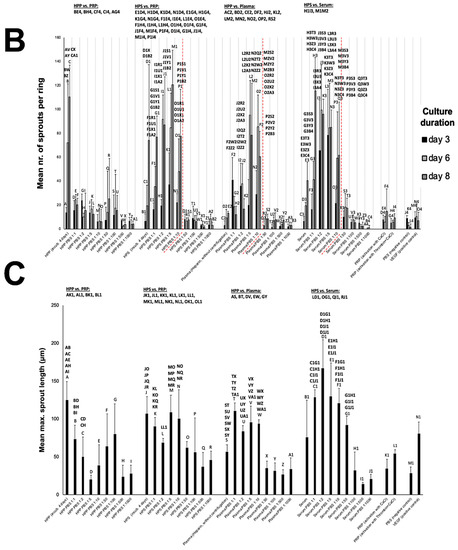 Effect of blood-derived secretomes on microvessel sprouting in the aortic ring assay in vitro. (A) Panel showing representative images of aortic rings, embedded in Matrigel and cultured in the presence of the shown blood-derived secretomes for 3, 6 and 8 days. (Bars = 100 µm). Microvessels sprouting from aortic rings are indicated by black arrows. Enlarged image sections are indicated by red insets. (B) Plot showing the mean number of sprouts per ring over a culture duration of 3, 6 and 8 days (n = 3). (C) Plot showing the mean maximum sprout length after a culture period of 8 days (n = 3). Capital letter pairs over plots indicate statistical comparison of corresponding data points. For all pair comparisons, p < 0.05, unless otherwise indicated. Error bars represent s.d.