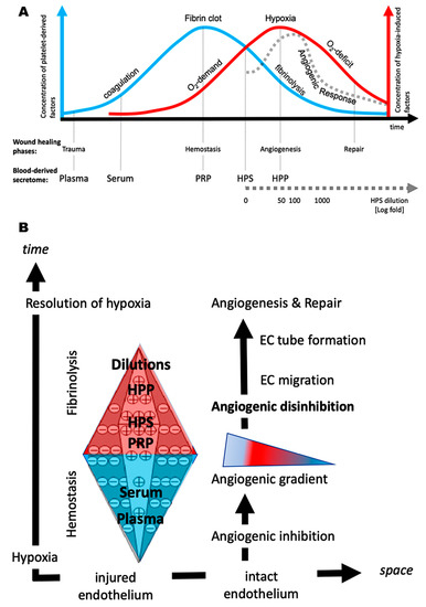 Biological basis underlying the utilization of different blood-derived secretomes. (A) Plot showing the representative correlation of different types of blood-derived secretomes (plasma, serum, PRP, HPS, HPP) with the progressive phases of wound repair. The coagulation-induced signaling phase (platelet-derived growth factors; blue curve) that supports haemostasis, correlates with PRP since it depends on the maximum concentration of platelets, while the hypoxia-induced signaling phase (PBC-derived growth factors; red curve) that drives angiogenesis, correlates initially with HPS, and eventually with HPP and HPS dilutions. The shape of the dotted gray curve represents the net angiogenic response, and is theoretically defined by subtracting anti-angiogenic platelet-derived signaling (blue curve) from pro-angiogenic hypoxia-induced signaling (red curve). (B) Proposed mechanism for the biochemical control of wound angiogenesis, and correlation of the various blood-derived secretomes (plasma, serum, PRP, HPS, HPP) with the different wound healing phases. Following completion of the haemostatic phase, the fibrin matrix undergoes controlled degradation through fibrinolysis, leading to depletion in the local pool of anti-angiogenic factors (e.g., PF-4) which are bound to fibrin (indicated by ‘’-‘’ sign), while up-regulation of pro-angiogenic factors (e.g., VEGF) though hypoxia (indicated by ‘’+’’ sign) leads to the formation of chemoattractive gradients that direct endothelial cell (EC) migration towards the injured site. Angiogenic disinhibition enables vascularization of the matrix through fibrinolysis-mediated EC invasion, which facilitates resolution of hypoxia and tissue repair.