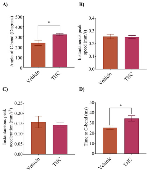 To determine if the properties of the escape response had been altered by exposure to THC, we recorded the C-bend following a mechanosensitive stimulus to the head of 2 dpf embryos. The C-bend response rate between the two groups was similar and there were no overt differences between the treatments. However, the angle of the C-bend was significantly greater in the THC treated animals compared with vehicle controls (Figure 2A; p < 0.05; n = 7–13). Analysis of the maximum speed and acceleration showed no significant differences in these parameters (Figure 2B,C; p > 0.05; n = 7–13). Further, the time to maximum bend of the trunk was greater in the THC treated animals (Figure 2D, p < 0.05; n = 7–13), likely because the bend angle was greater.