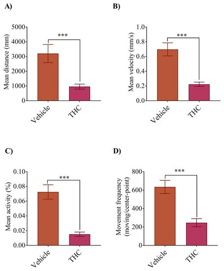 THC exposure affects free swimming activity (locomotion) of zebrafish embryos at 5 dpf. Bar graphs display changes in larval mean distance moved (A), mean velocity (in mm/s for one hour) (B), mean activity (% rate for one hour) (C), and frequency of swim bouts within one hour (D). *** significantly different from vehicle control, p < 0.001.