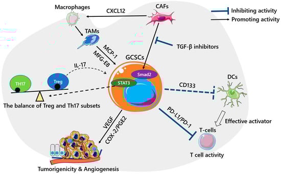 Dendritic cells (DCs) are professional antigen-presenting cells (APCs) and the most effective activators of resting or naive T cells in vitro and in vivo [48]. A recent study using CD133 positive, CD29 positive and CD44 positive CSCs showed that the number of activated DCs was decreased after CSC lysate/LPS (intracellular) or CSC conditioned medium/LPS (extracellular) stimulation. This result suggested that CSCs might impair the functions of DCs [49]. Although the relationship between DCs and GCSCs is still unclear, the functional DCs are required in the immune microenvironment for T cell activation. Thus, the relationship should be determined by further investigations (Figure 1).