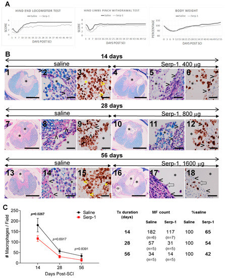 The scores from the hind limb pinch withdrawal test were summarized for both legs (Figure 2A) and revealed reduction during the first week post-SCI but then recovered during the second week and remained constant for the remainder of the study in both treatment groups. The scores for saline treatment were moderately higher than the scores for Serp-1 treatment.