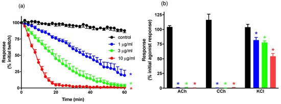 (a) The concentration-dependent neurotoxic effects of N. atra venom (1–10 µg/mL) on indirect twitches of the chick biventer cervicis nerve-muscle (CBCNM) preparation. (b) The concentration-dependent effects of N. atra venom (1–10 µg/mL) on contractile responses to acetylcholine chloride (ACh) (1 mM), carbachol (CCh) (20 µM), and potassium chloride (KCl) (40 mM) in the CBCNM. * p < 0.05, significantly different from (a) control at 60 min or (b) pre-venom response to same agonist. n = 6.