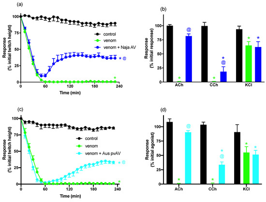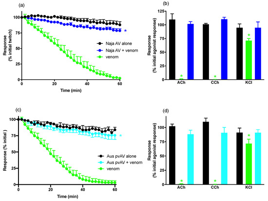 The prior addition of Chinese N. atra monovalent antivenom (0.75 U/mL, 2× the recommended titre), or Australian polyvalent snake antivenom (3 U/mL, 10× the recommended titre), markedly attenuated the neurotoxic actions of venom (3 µg/mL) (Figure 2a,c) and prevented the inhibition of contractile responses to ACh, CCh, and KCl (Figure 2b,d).