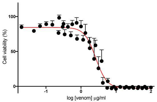 Treatment of L6 cells with N. atra venom resulted in a concentration-dependent inhibition of cell viability (Figure 5), with an IC50 of 2.8 ± 0.48 μg/mL.