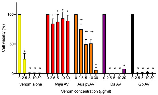 The effects of N. atra venom (0–30 μg/mL), in L6 cells, in the presence and absence of N. atra antivenom (Naja AV, 4 U/mL), G. brevicaudus antivenom AV (Gb AV, 24 U/mL), D. acutus antivenom AV (Da AV, 8 U/mL) or Australian polyvalent AV (Aus pvAV, 33 U/mL). * p < 0.05, significantly different from control (i.e., 0 venom); + p < 0.05, significantly different from same concentration of venom in the absence of antivenom.