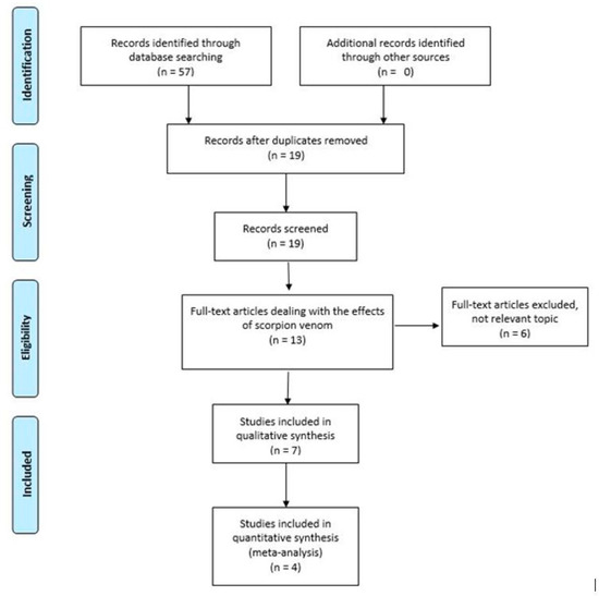 From the database searches (Scopus, Pub Med, Web of Science, and EBSCO), we identified 57 records. With the use of the EndNote software, the duplicates were removed, resulting in 19 records. With the inclusion and exclusion criteria applied, we maintained 13 articles, of which only 7 dealt with the effects of scorpion venom on cancer cell lines and only 4 studies reported the data used in the meta-analysis. All selection and screening procedures are described in the flow chart, shown in Figure 1.