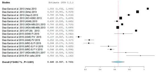 The meta-analysis showed an absence of heterogeneity with I2 equal to 99.702% with Q = 5030.957 df 15. p <0.001, and a random effect model was applied. The results shown in Figure 2 show that a pooled mean of IC50 was obtained at 0.645 mg/mL (95% CI: 0.557, 0.733), standard error (SE) = 0.045, p < 0.001.