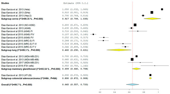 Forest plot of the 4 Subgroups. Subgroup Cervix: IC50 0.917 mg/mL (Hela, SiHa, Hep-2); Subgroup Lung: IC50 0.460 mg/mL (NCI-H292, A549, MRC-5); Subgroup mammary gland/breast: IC50 0.699 mg/mL (MDA-MB-231, F3II, MDA-MB-468); Subgroup colorectal, adenocarcinoma: IC50 mg/mL 0.890 (HT-29). The results of the meta-analysis for each subgroup are highlighted in bold. Yellow rhombuses in the forest plot indicate the average effect for each subgroup investigated, the red line shows the position of the average value and the rhombus in light blue shows the measure of the average effect. NA stands for not applicable.