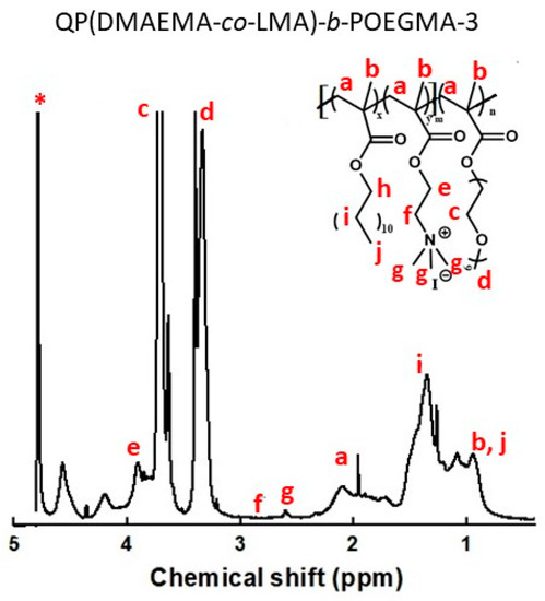 1H-NMR peaks of the QP(DMAEMA-co-LMA)-b-POEGMA-3, (Figure 1, 300 MHZ, D2O, ppm): 4.1 (2H, - COOCH2 (CH2)10CH3-) 3.82 (4H, -(CH2CH2O)9CH3-), 3.41 (3H, -(CH2CH2O)9CH3-), 3.02 (2H, -OCH2CH2NH(CH3)2-), 2.72 (9H, -NH(CH3)3-), 2.21 (2H, -CH2C-), 1.35 (2H, -CH2(CH2)10CH3-), 0.98 (3H, -CH2CCH3-, 3H, -CH2(CH2)10CH3).