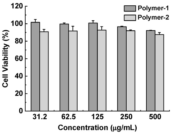 Cytotoxicity assays were conducted on the aggregates of the P(DMAEMA-co-LMA)-b-POEGMA and QP(DMAEMA-co-LMA)-b-POEGMA in order to determine whether these diblock terpolymers meet the necessary biological criteria to be utilized as insulin carriers. Endogenous insulin mainly takes effect in the liver [22,23]. The HepG2 cell viability results are depicted in Figure 2. For brevity, P(DMAEMA-co-LMA)-b-POEGMA aggregates will be referred as Polymer-1 and QP(DMAEMA-co-LMA)-b-POEGMA aggregates as Polymer-2, respectively.