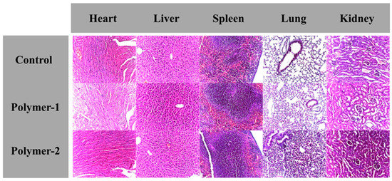 As the cell viability assays were promising, in vivo biocompatibility studies, for both terpolymers, were performed. Solutions of both polymers were injected subcutaneously in healthy mice separately at a dose of 1 mg·kg−1 for 15 days continuously. The hematoxylin−eosin stained histological images of the murine organs are shown in Figure 3.
