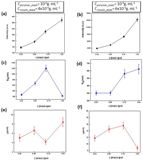 (a) Intensity, (c) Rh, (e) zeta potential (surface charge) plots as a function of (−)INS/(+)polymer charge ratio for the case of the polymer stock solution with concentration c = 10−4 g·mL−1 and of insulin stock solution c = 4 × 10−4 g·mL−1, and (b) intensity, (d) Rh, (f) zeta potential (surface charge) plots as a function of (−)INS/(+)polymer charge ratio for the case of the polymer stock solution concentration c = 10−3 g·mL−1 and of the insulin stock solution c = 6 × 10−3 g·mL−1.