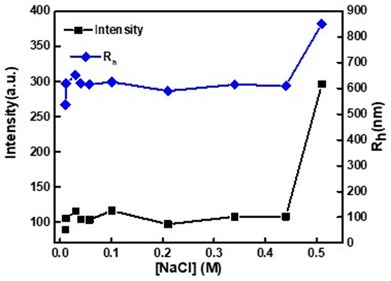Ionic strength studies were performed in the mixed solution where the (−)INS/(+)polymer ratio was equal to 0.25. In Figure 6, variations of scattering intensity and Rh as a function of ionic strength are depicted. Ionic strength is a critical parameter for biomolecules delivery systems obtained by electrostatic interactions that needs to be investigated because one gains information for possible effects on the mass, size and structural and colloidal stability at close to physiological conditions (CNacL = 0.15 M simulates the concentration of the human blood). When the ionic strength increases in solutions that contain electrostatic complexes formed by polyelectrolytes and proteins, complex disintegration may occur. Such behavior originates from the decrease of electrostatic interactions between the oppositely charged groups because of salt screening effects. Alternatively, further aggregation or precipitation phenomena of complexes dispersed in the medium may occur due to salting out effects (decrease of solvent quality towards the dispersed complexes) [25,26].