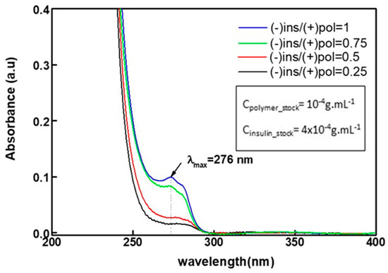 UV studies were performed for the QP(DMAEMA-co-LMA)-b-POEGMA/insulin complexes in order to detect if structural changes occurred to insulin after the complexation with cationic polymer segments. Insulin consists of two peptide chains referred to as the A chain and B chain. A and B chains are connected with two disulfide bonds, and an additional disulfide is formed within the A chain [27]. Usually, the A chain consists of 21 amino acids and the B chain of 30 amino acids [28]. Tyrosine and phenylalanine residues of protein chains present optical absorption within the range of 230–300 nm [29]. UV studies in that wavelength range enable the determination of protein concentration, provide information about the local environment of these residues [30]. UV absorption in the range 180 to 230 nm is due almost entirely to π→π∗π→π∗ transitions in the peptide bonds, giving information about the protein secondary structure (protein folding) [29]. Unfortunately, insulin does not contain tryptophane, the more active amino acid residue in terms of fluorescence efficiency. However, tyrosine and phenylalanine residues of insulin can be utilized for UV-Vis studies. A considerable difference in the absorbance intensity is observed when (−)INS/(+)polymer charge ratio is 0.75 and 1 due to the presence of more insulin molecules in the mixed solutions (Figure 7). In these two cases, the peak of maximum absorbance wavelength is deciphered more clearly. The maximum absorbance wavelength (λmax) is observed at 276 nm. The λmax is observed at the same wavelength in cases the (−)INS/(+)polymer charge ratio is 0.25 and 0.5 but the absorbance intensity is significantly lower. Based on literature data, the presence of a single peak at ca. 280 nm verifies that significant changes in the structure of insulin did not occur during the complexation process [28]. In other words, based on the UV-Vis spectra of the QP(DMAEMA-co-LMA)-b-POEGMA/insulin complexes, it is concluded that insulin did not undergo structural changes and is not denatured in all (−)INS/(+)polymer ratios investigated.