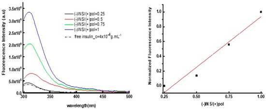 Fluorescence measurements were also conducted at excitation wavelength of 280 nm in order to provide more information on the conformation of insulin after its complexation with the terpolymer aggregates, via examining the intrinsic fluorescence of the amino acid tyrosine that is present in both insulin chains. The fluorescence spectra of the QP(DMAEMA-co-LMA)-b-POEGMA/insulin complexes at all (−)INS/(+)polymer charge ratios are depicted in Figure 8a and the normalized fluorescence intensity at peak maximum plot as a function of (−)INS/(+)polymer charge ratio at 310 nm (peak maximum wavelength) is displayed in Figure 8b. The variation of the wavelength in which the maximum insulin fluorescence intensity is noticed is less than 5 nm, indicating that there are no considerable differences in the conformation of the insulin after the QP(DMAEMA-co-LMA)-b-POEGMA/insulin complexes were formed. As it is expected, the fluorescence intensity rises as (−)INS/(+)polymer charge ratio increases. A linear trend is observed in the increase of the intensity as a function of (−)INS/(+)polymer charge ratio, which may only indicate that the increase of insulin concentration did not result in fluorescence quenching and/or precipitation of formed complexes.