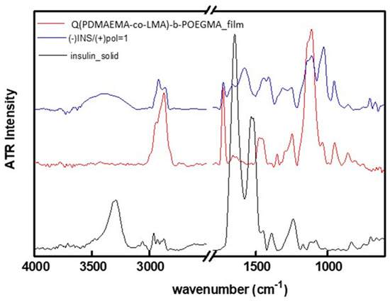 ATR-FTIR measurements were conducted in order to investigate the interactions between the QP(DMAEMA-co-LMA)-b-POEGMA aggregates with insulin molecules at the functional groups level. In Figure 9, comparative ATR-FTIR spectra of solid insulin, QP(DMAEMA-co-LMA)-b-POEGMA film and QP(DMAEMA-co-LMA)-b-POEGMA/insulin complex at (−)INS/(+)polymer = 1 film, are presented.
