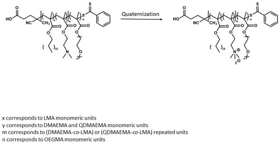 P(DMAEMA-co-LMA)-b-POEGMA diblock terpolymers precursors were prepared by implementation of two step reversible addition-fragmentation chain-transfer (RAFT) polymerization process, utilizing 4-cyano-4-(phenylcarbonothioylthio) pentanoic acid (CPAD) as the chain transfer agent (CTA). QP(DMAEMA-co-LMA)-b-POEGMA diblock terpolymers were obtained by performing a quaternization reaction to the P(DMAEMA-co-LMA)-b-POEGMA diblock terpolymers, using methyl iodide (CH3I) as the quaternizing agent. By carrying out the quaternization reaction, conversion of the tertiary amine groups of the PDMAEMA segments to quaternary, permanently positively charged QPDMAEMA units, was accomplished. The chemical structure of the QP(DMAEMA-co-LMA)-b-POEGMA diblock terpolymers utilized in this study is presented in Scheme 1.