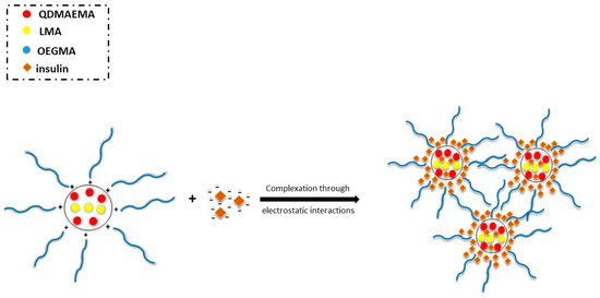 As it was mentioned before, the complexation results from the electrostatic interactions between the positive charges of the quaternary ammonium salt groups of the polymer and the negative charges that insulin molecules contain at pH = 7. In this case, based on the molecular characteristics of the quaternized diblock terpolymer, ten positive charges correspond to each macromolecular chain, while each insulin molecule contains four negative charges [22]. A schematic demonstration of the polyplexes formed as the result of the complexation of the QP(DMAEMA-co-LMA)-b-POEGMA aggregates with insulin, is presented in Scheme 2. In this case, insulin molecules are anticipated to be complexed with the QPDMAEMA segments, which constitute the greatest part of the core due to polymer composition, but it is also expected that the QPDMAEMA segments would comprise mostly the periphery/external part of the core and the interface between core and corona, due to their hydrophilic nature. LMA segments would occupy the internal part of the core due to hydrophobic interactions, which results in the formation of stable QP(DMAEMA-co-LMA)-b-POEGMA/insulin complexes. POEGMA neutral hydrophilic macromolecular chains constitute the corona of the mixed complexes and contribute significantly to the colloidal stabilization of the complexes in the aqueous medium.