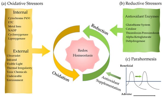 Redox homeostasis and antioxidant supplementation. (a) Oxidative stressors comprise of external and internal stressors, exerting oxidative chemical reactions in organism. Oxidation is an indispensable bioenergetic process to sustain life. (b) Reductive stressors are products of antioxidative enzymes that generate antioxidants in response to regular oxidation activity and increased oxidative stress. (c) Antioxidant supplementation attempts to shift the biphasic response from adverse to beneficial phase to maintain nucleophilic tone. This mechanism is called parahormesis.