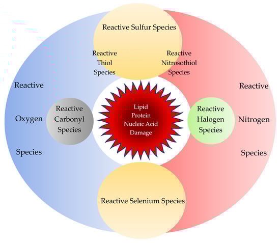 Reactive chemical species. Reactive chemical species comprise of not only reactive oxygen species and reactive nitrogen species, but also reactive sulfur, carbonyl, halogen, and selenium species. Sulfur reacts with oxygen or nitrogen to form reactive thiol or nitrosothiol species, respectively. All reactive chemical species react in concert during regular cellular activity but may cause oxidative stress to damage cellular components such as proteins, lipids, and nucleic acids.
