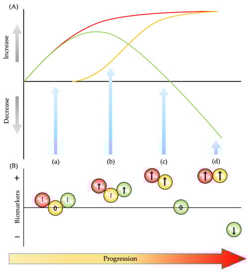 Dynamics of redox components in disease progression. (A) – (red line): reactive chemical species and activities of oxidative enzymes increase gradually. – (orange line): the degradation products increase accordingly upon exhaustion of antioxidative enzymes’ activities. – (green line): antioxidative enzymes offset the effects of oxidative enzymes in the early phase, however; the antioxidative activities decline and, finally, fatigue in the later phase, resulting in the exacerbation of inflammation and cellular damage. (B) Biomarkers of three redox components may present different values. (a) The levels of oxidative enzyme slightly increase, but the degradation markers stay in a normal range. The antioxidative markers also slightly increase. (b) The oxidative markers further elevate, and the degradation markers start slightly increasing. The antioxidative markers also stay elevated. (c) The oxidative enzyme markers increase, but antioxidative markers return to normal range. The degradation product markers further elevate. (d) The oxidative markers greatly increase, but the antioxidative markers decline. The degradation products markers greatly elevate.
