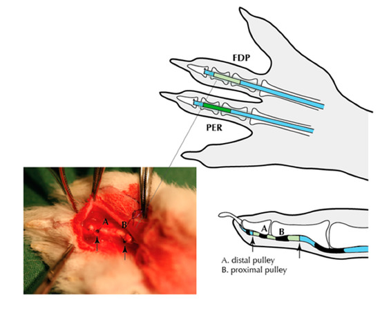 Schematic illustration of the rabbit transplant model. Flexor digitorium profundus (FDP) tendons were transferred from the neighboring digit, and Peroneus tendon (PER) tendons were transferred from a separate incision on the foreleg.