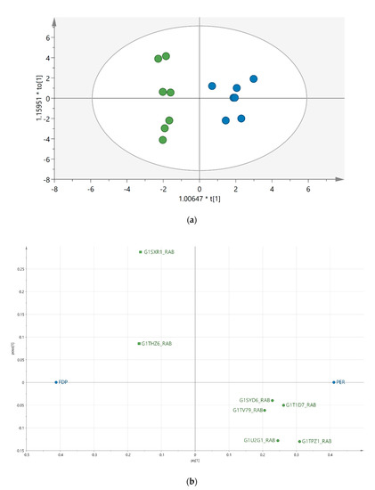 (a) An OPLS-DA (orthogonal partial least square discriminant analysis) model showing the discriminant separation between FDP (green filled circles and PER (blue filled circles). The longitudinal dimension (Y-axis) shows the interclass discrimination, and the latitudinal dimension (X-axis) shows the intraclass discrimination between the groups. (b) Loading plot corresponding to significant proteins, with a variable of importance (VIP) value > 1 important for FDP (square) and PER (circle). G1TPZ1_RABIT (Galectin), G1T1D7_RABIT (Periostin), G1U2G1_RABIT (Histone H2A), G1SYD6_RABIT (Lamin-A/C), G1TV79_RABIT (SerpinH1), G1SXR1_RABIT (Prolargin), G1THZ6_RABIT (Ig gamma chain C region).