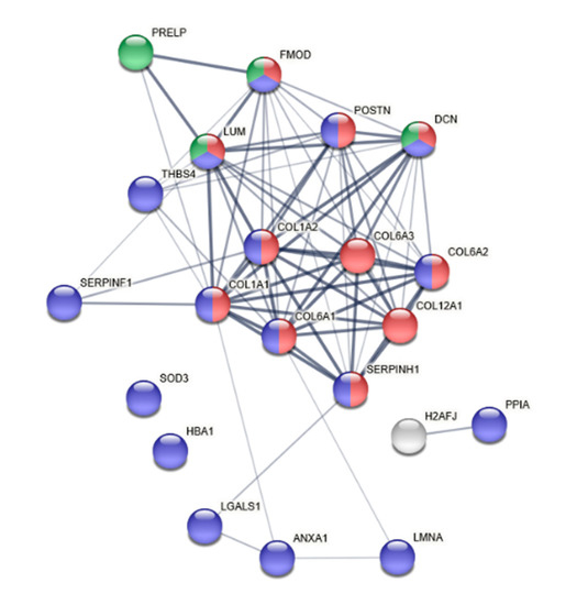 Pathway analysis of altered proteins between FDP and PER. Each protein is represented by a colored node, and protein–protein interaction is represented by an edge visualized as a line. Higher combined confidence scores are represented by thicker lines/edges. The significant protein–protein interactions enrichment (PPI) (p-value < 1.0 × 10−16) identified three biological processes that the proteins were involved in; extracellular matrix organization (red), response to chemical (blue), and glycosaminoglycan catabolic process (green).