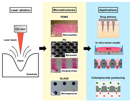 Laser machining has long been utilized as a salient alternative or supplementary tool to some lithography-based approaches for microfabrication since the late 1980s [3,4]. CO2 lasers are one of the most conventionally used laser sources for rapid prototyping and cost-effective microfabrication. Microchannel engraving has been demonstrated as a rapid fabrication method for microfluidic devices [5,6]. Laser drilling, termed ablation, of a single spot is another conventional technique to generate an array of microstructures, i.e., concavities or through-holes applied in many industrial and research applications [7,8]. Combined with the use of different substrate materials, a wide range of downstream tissue or cellular-based utilities can be readily achieved [3,9,10,11]. For example, microscale needles, termed microneedles (MNs), enable the delivery of large molecules, such as proteins, DNA and vaccines, into the skin in a painless, rapid and efficient way [12]. The female MN polydimethylsiloxane (PDMS) mold, used for fabrication of polymeric MNs, can be easily and conveniently made by laser drilling. Additionally, microwell technology fabricated by CO2 lasers has been applied in generating cellular spheroids [3,13] and circulating tumor cell cultures [14]. Microwells are conducive to the formation of uniform, size-controlled, multicellular tumor spheroids (MCTSs). MCTSs imitate three-dimensional (3D) growth in a way similar to avascular tumors in vivo in terms of their cell–cell interaction. Studies have also indicated that drug screening carried out on MCTSs is more relevant than that of traditional two-dimensional (2D) cultures, suggesting the potential use of microwells in future drug screening and exploration of different cancer treatment modalities [15].