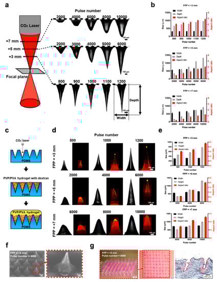 Fabrication of polyvinylpyrrolidone/polyvinyl alcohol (PVP/PVA) MN arrays using a laser-ablated PDMS mold. (a) Schematic diagram of the laser-ablation process for creating PDMS molds with various CO2 laser pulse numbers in focal plane positions (FPPs). (b) Evaluation of the widths, depths, and aspect ratios of the PDMS molds created with different pulse numbers and FPPs. (c) Schematic diagrams of PVP/PVA MN fabrication from ablated PDMS molds. (d) Characteristics and (e) specifications of Tetramethylrhodamine isothiocyanate TRITC-dextran-loaded PVP/PVA MNs. (f) SEM image of the PVP/PVA MN array. (g) Brightfield micrographs of PVP/PVA MNs containing TRITC-dextran (left), porcine cadaver skin after MN insertion (middle), and a corresponding histological section (right).
